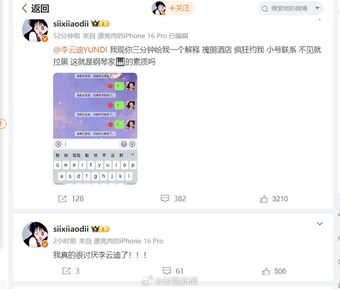 尚融 李云迪被李汶翰前女友指控酒店约见后拉黑,女方晒开房细节