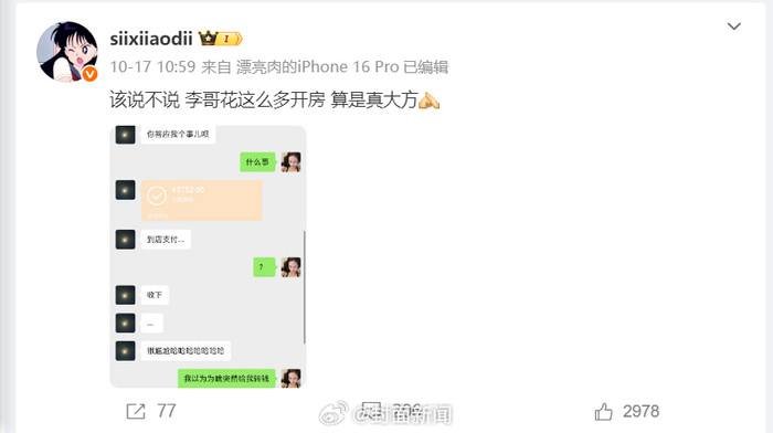 @封面新闻记者查询此前内容发现,10月17日时尚融,她曝光了一笔与@UNIQ-李汶翰的3732元微信转账记录,引发多方猜测。
